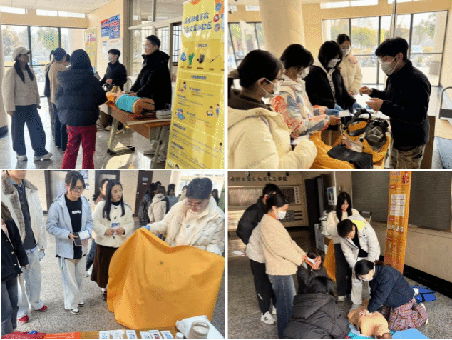 在个人防护装备体验区,师生们学习了如何根据场景选择并正确佩戴口罩、护目镜与手套等,并了解了防毒面具的选型与气密性检查方法等,筑牢了安全作业的“第一道防线”。灭火设施体验区内,参与者通过判断模拟火情选择正确的灭火器材,并动手使用灭火毯进行扑救练习,深化了“见火不慌、抬手就灭”的初期火灾应对能力。漏电触电应急处置区,以流程图清晰展示了“断电-救援”流程,学习使用绝缘工具进行安全移离,强化了在紧急情况下冷静、科学的处置意识。实验室废弃物分类区,通过卡片分类互动,清晰掌握了不同危险废弃物的分类原则与标识填写要求,提升了实验室环保与规范管理的自觉性。在心肺复苏操作区,参与者在专业指导人员带领下,利用模型认真练习按压、通气等关键步骤,掌握了基础急救技能。
