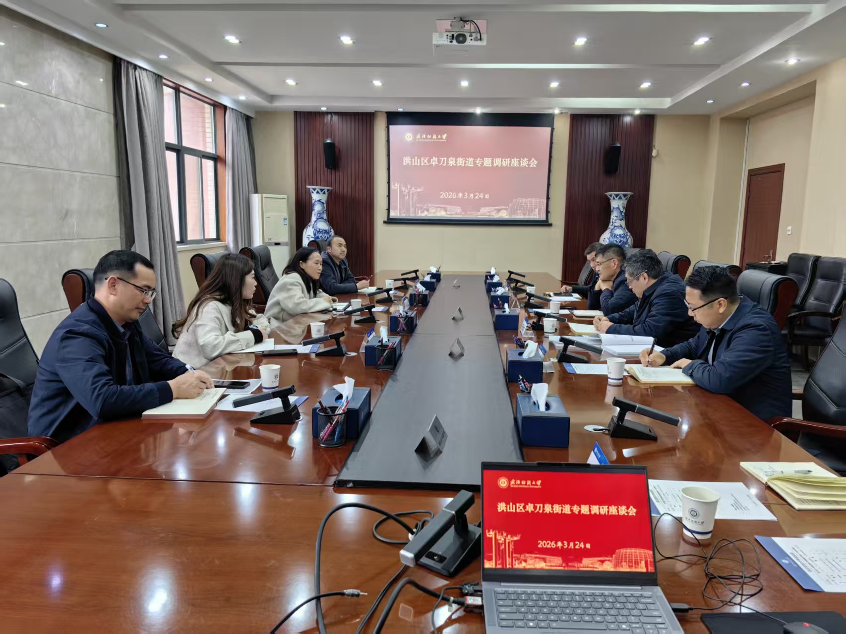3 月 24 日,武汉市洪山区卓刀泉街道办事处党工委书记李良蓉一行来校专题调研雄楚校区欧亚达项目有关工作。学校办公室主任黄纯辉、资产与实验室管理处处长赵金龙等接待座谈,会议由黄纯辉主持。